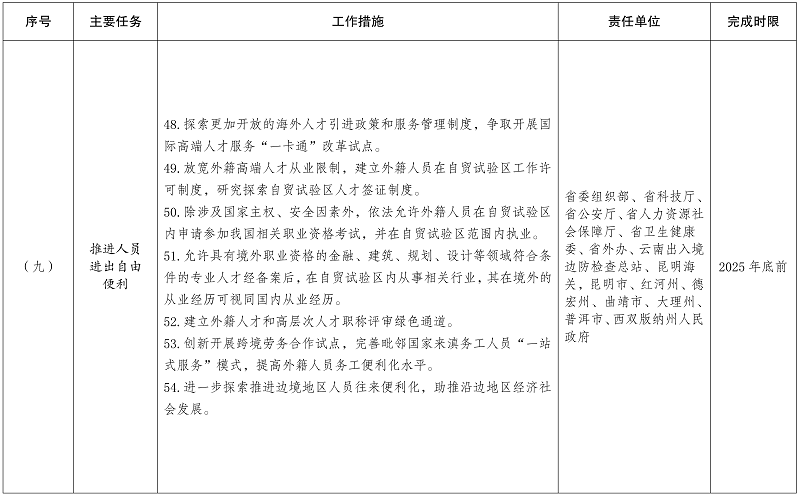 (十一)推进人员进出自由便利。探索更加开放的海外人才引进政策和服务管理制度,争取开展国际高端人才服务“一卡通”改革试点。放宽外籍高端人才从业限制,建立外籍人员在自贸试验区工作许可制度,研究探索自贸试验区人才签证制度。除涉及国家主权、安全因素外,依法允许外籍人员在自贸试验区内申请参加我国相关职业资格考试,并在自贸试验区范围内执业。允许具有境外职业资格的金融、建筑、规划、设计等领域符合条件的专业人才经备案后,在自贸试验区内从事相关行业,其在境外的从业经历可视同国内从业经历。建立外籍人才和高层次人才职称评审绿色通道。创新开展跨境劳务合作试点,完善毗邻国家来滇务工人员“一站式服务”模式,提高外籍人员务工便利化水平。进一步探索推进边境地区人员往来便利化,助推沿边地区经济社会发展。(责任单位:省委组织部、省科技厅、省公安厅、省人力资源社会保障厅、省卫生健康委、省外办、云南出入境边防检查总站、昆明海关按照职责分工负责;完成时限:2025年底前)